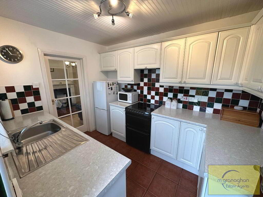 White kitchen with a range of high and low level units, formica work surfaces, stainless steel sink drainer, Space for free standing oven, space for fridge, plumbed for washing machine, part tiled walls, ceramic tiled flooring.