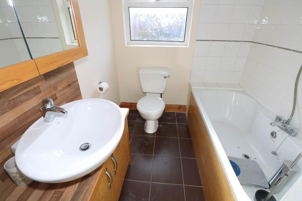 White suite comprising panelled bath, vanity unit wash hand basin, low flush WC, ceramic tiled floor and part tiled walls.