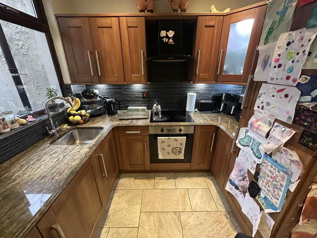 Granite work surfaces, stainless steel sink drainer, integrated hob & oven, black extractor fan, build in fridge freezer, part tile walls, ceramic tiled flooring