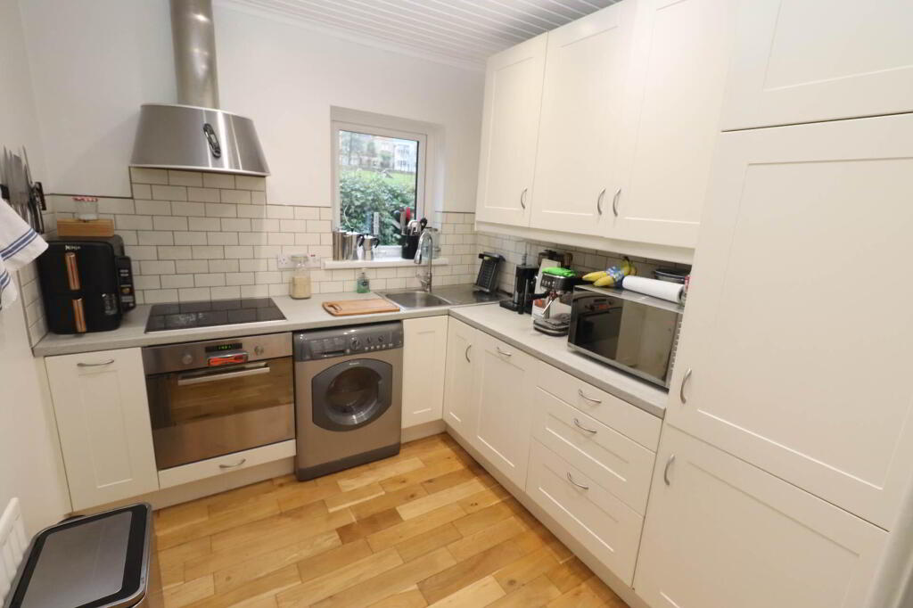 Range of high & low level units, formica work surfaces, stainless steel sink drainers, integrated hob & oven, stainless steel extractor fan, built in fridge freezer, plumb for washing,solid wooden flooring