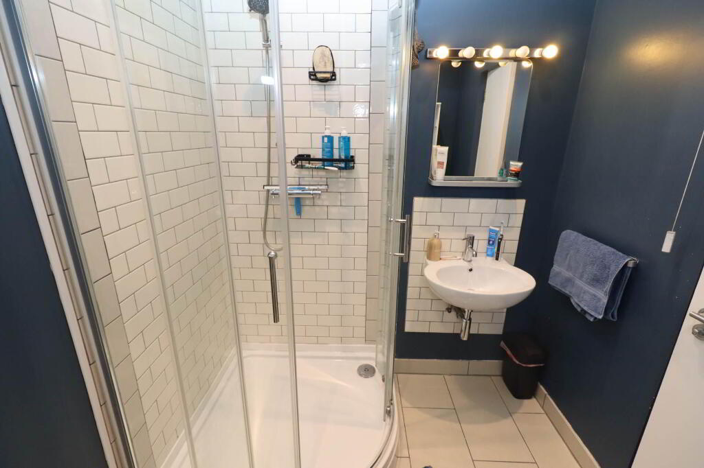 White family suite with shower cubicle with overhead mains shower, wall fixed wash hand basin, low flush W/C, chrome towel rail, part tiled walls, ceramic tiled flooring.