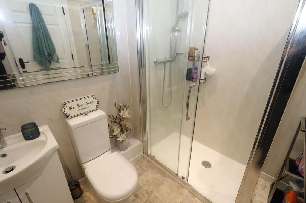White suite comprising of walk in shower, vanity unit wash hand basin, low flush WC, pvc wall covering, vinyl flooring, chrome towel rail