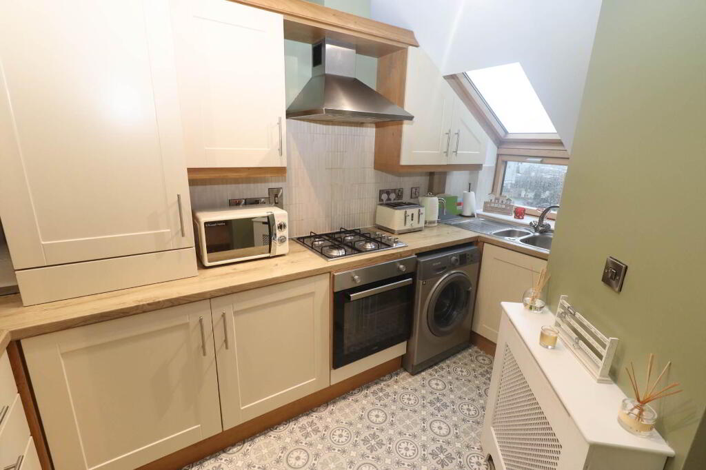 Fitted kitchen with a range of high and low level units, formica work surfaces, stainless steel sink drainer, built in oven with four ring gas hob and overhead stainless steel extractor fan, plumbed washing machine, part tiled walls, vinyl flooring, ceiling spots and roof window for natural light.