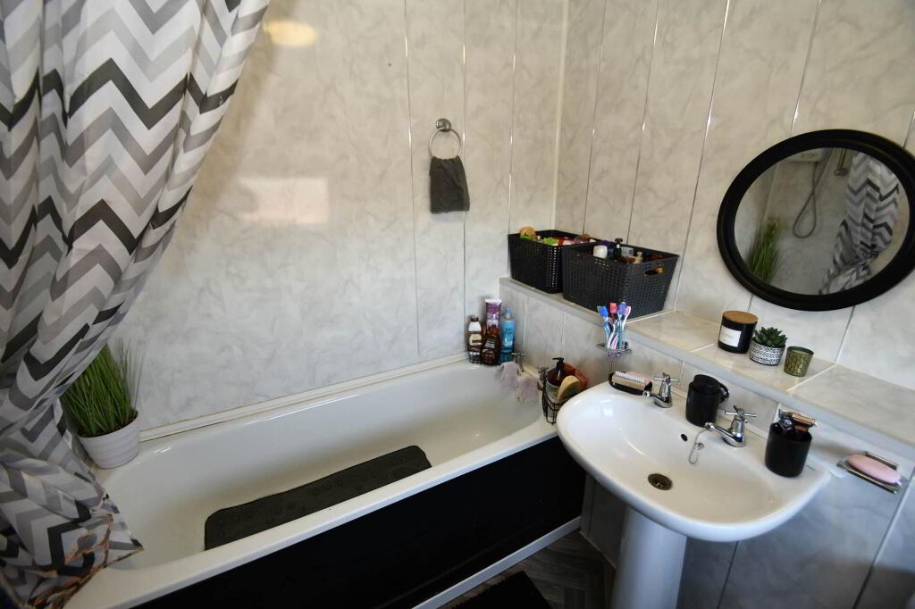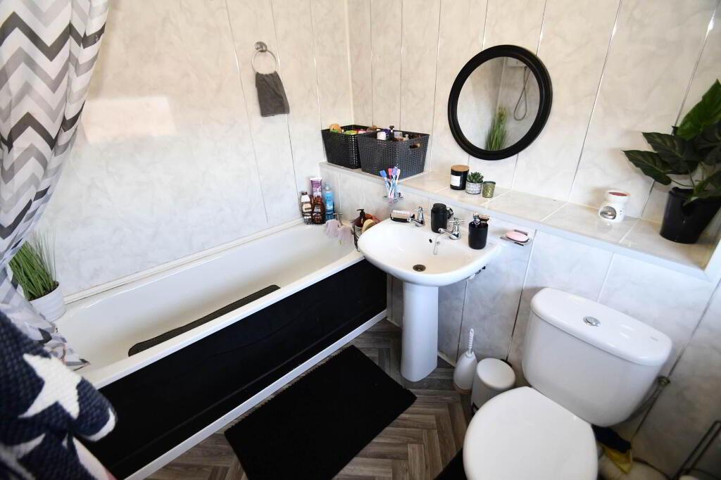 White suite comprising of panel bath, low flush WC, pedestal wash hand basin,pvc wall panels, vinyl flooring.