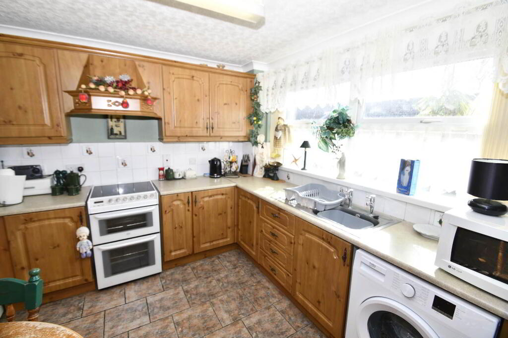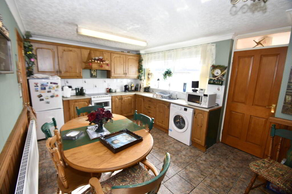 Fitted kitchen with a range of high and low level units, formica work surfaces, stainless steel sink drainer,space for freestanding cooker, space for washing machine, dining area part tiled walls, ceramic tiled flooring, wooden wall panelling, coven ceiling