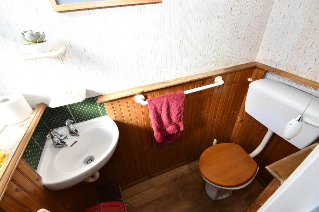 Wash hand basin, low flush WC, vinyl flooring, wooden wall panelling