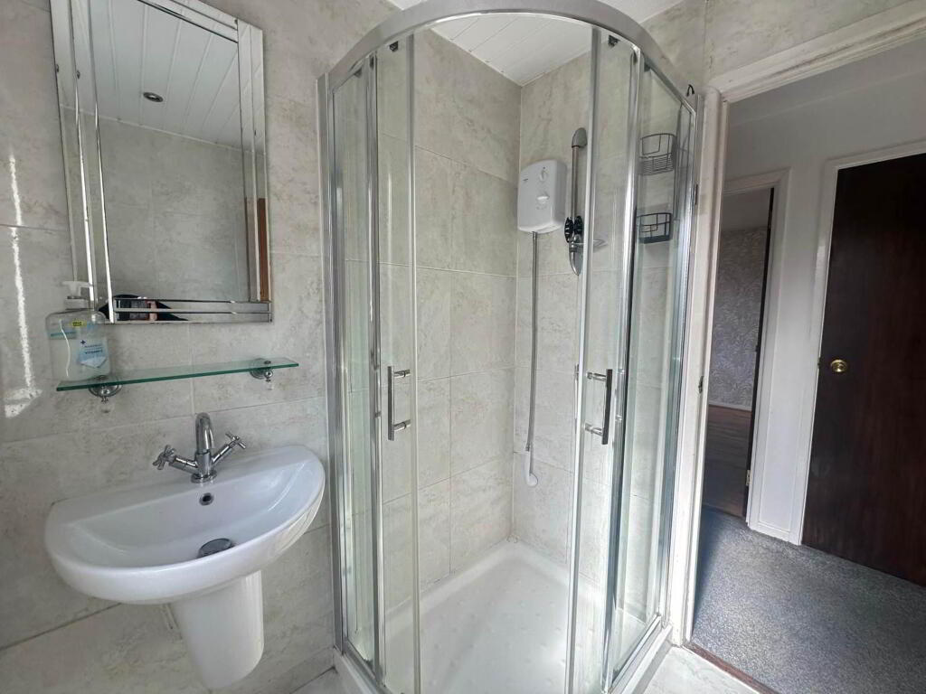 BATHROOM - 6'0" (1.83m) x 6'4" (1.93m) White suite comprising walk in shower cubicle, low flush W/C, wash hand basin, ceramic wall tiles, ceramic flooring, tongue & groove ceiling, ceiling spotlights