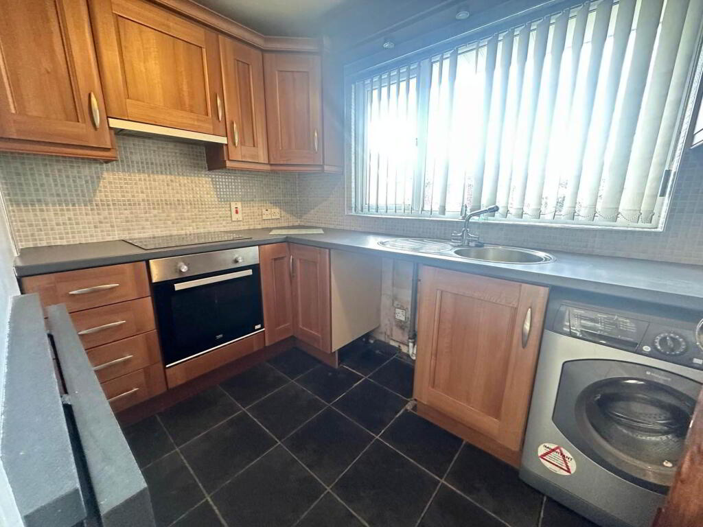 KITCHEN - 10'11" (3.33m) x 6'0" (1.83m) Range of high and low level units, formica worktops, stainless steel sink drainer, plumbed for washing machine, integrated hob & oven, ceramic wall tiles, ceramic flooring