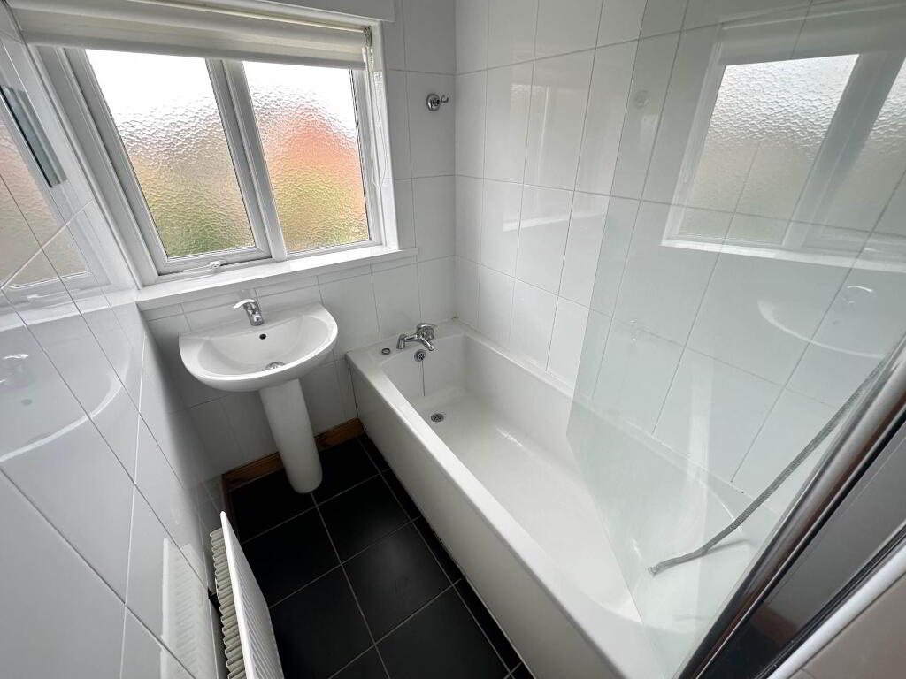 White suite comprising of panel bath, pedestal wash hand basin, fully tiled walls, ceramic tiled flooring.