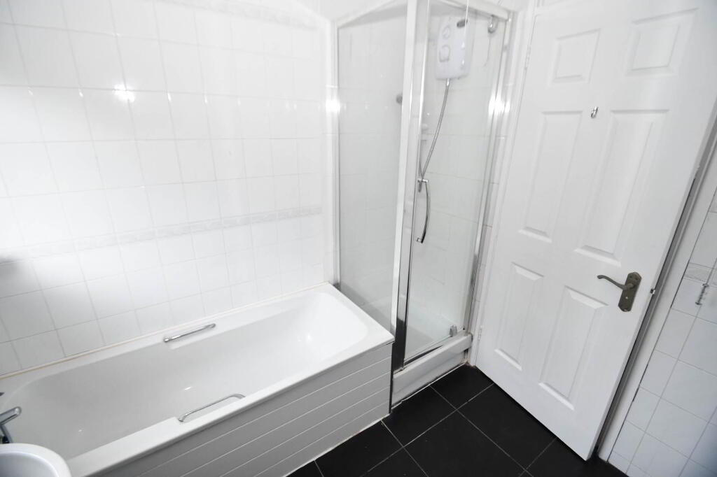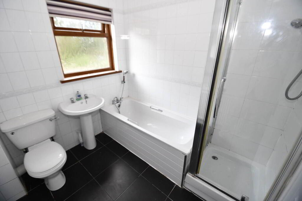 White suite comprising of panel bath, seperate shower, low flush w/c, pedestal wash hand basin, fully tiled walls, ceramic tiled flooring.