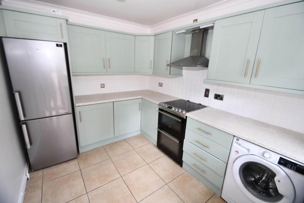 Fitted kitchen with a range of high and low level units, formica work surfaces, stainless steel sink drainer, stainless steel extractor fan, plumbed for washing machine, part tiled walls and ceramic tiled flooring.
