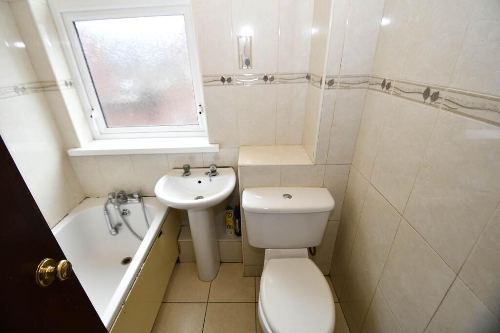 Panelled Bath, Low flush W.C, Pedestal wash hand basin, Ceramic tiled floor, Part tiled walls.