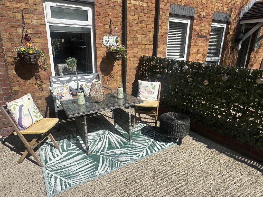 Enclosed rear with tiled patio area, garden in lawn and mature hedging