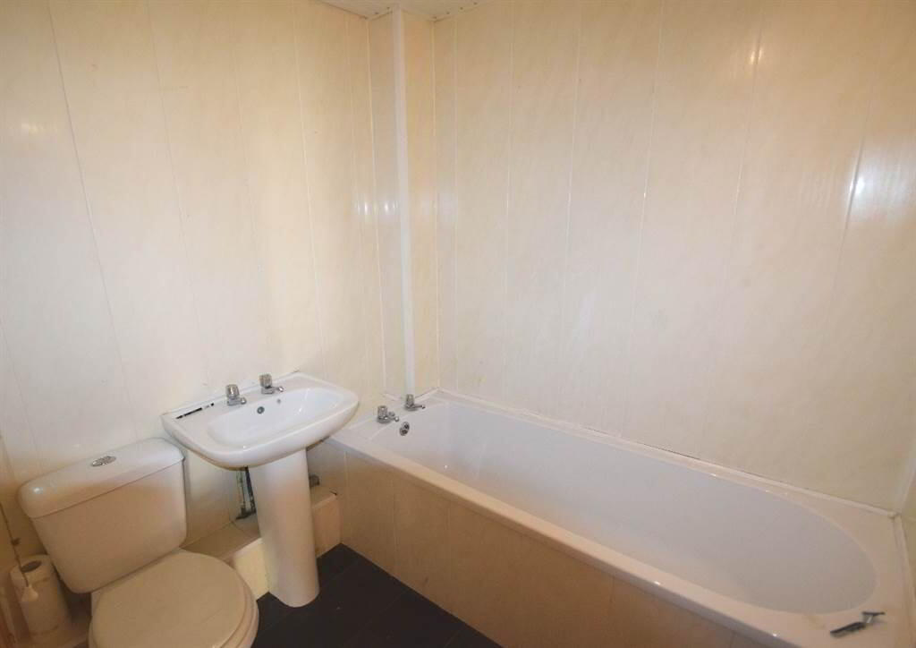 White suite comprising panel bath, low flush W/C, pedestal wash hand basin, PVC wall cladding, PVC ceiling