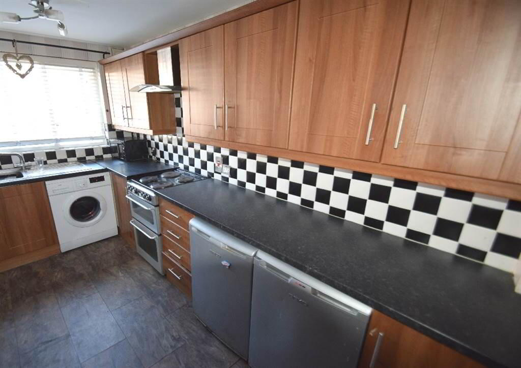 Range of high and low level units, formica worktops, stainless steel sink drainer, plumbed for washing machine, stainless steel extractor fan, part tiled walls - SNUG: