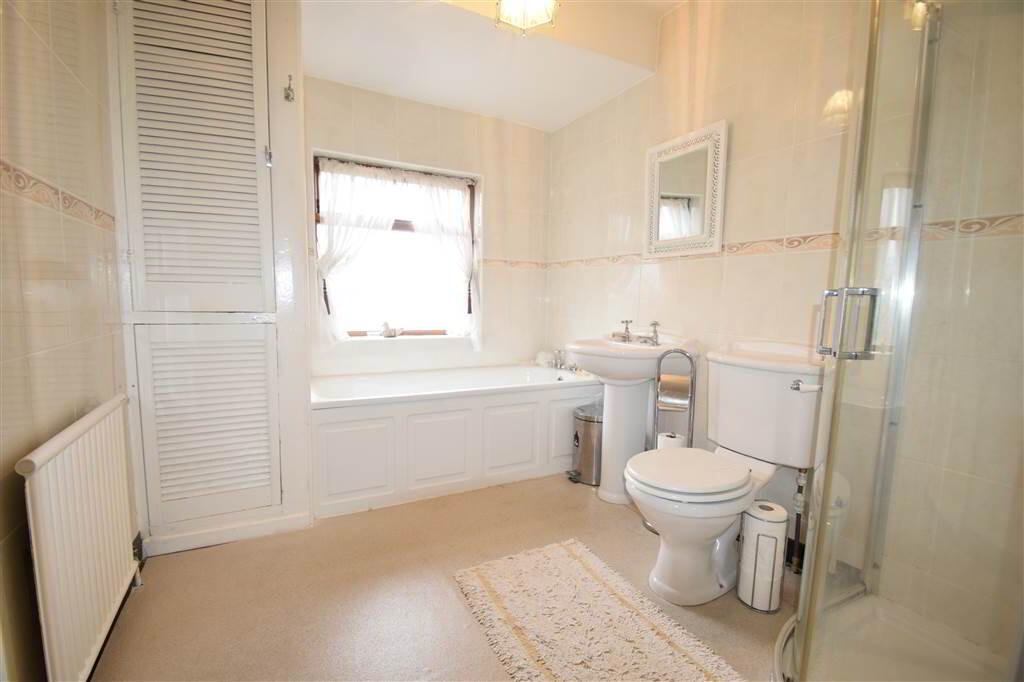 White suite comprising panel bath, walk in corner shower cubicle, low flush W/C, pedestal wash hand basin, ceramic wall tiles