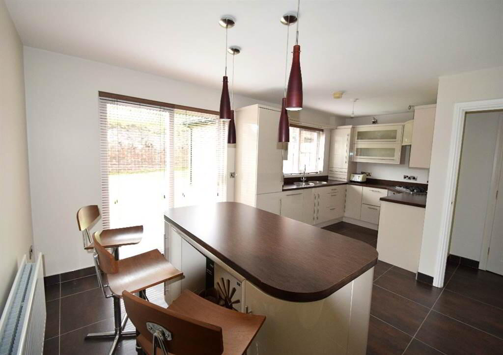 Range of high and low level units, formica work surfaces, stainless steel sink drainer, integrated dish washer, integrated fridge freezer, gas hob and oven, island, patio doors to rear