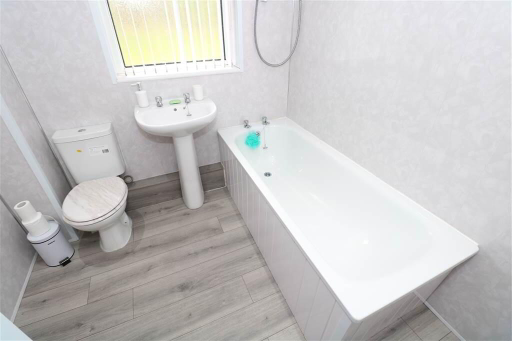 White suite comprising panel bath, low flush W/C, pedestal wash hand basin
