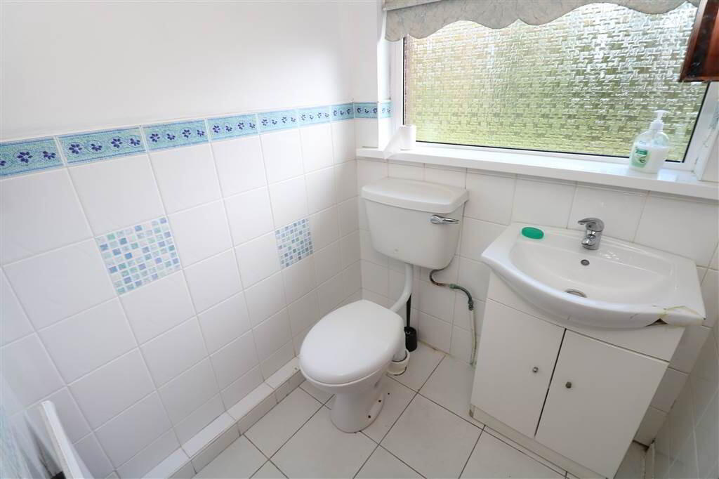 White suite comprising of panel bath with electric shower, low flush WC, pdestal wash hand basin, ceramic floor and wall tiles