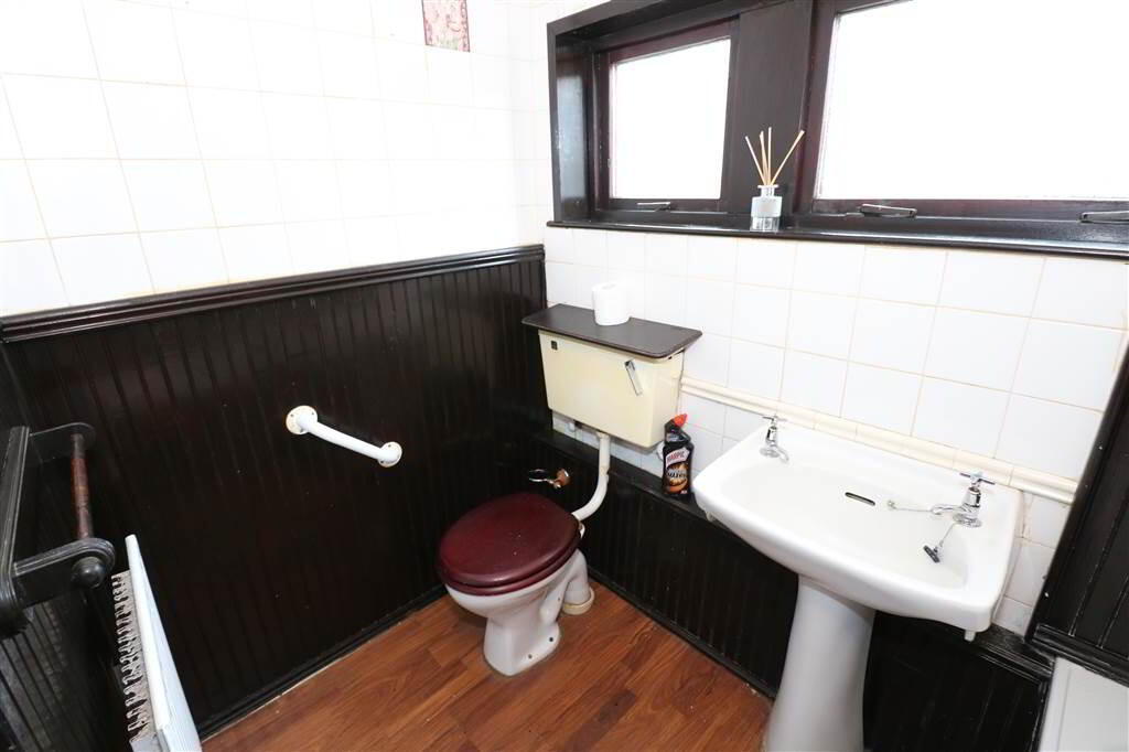 White suite comprising panel bath, low flush W/C, pedestal wash hand basin, fully tiled walls, laminate flooring