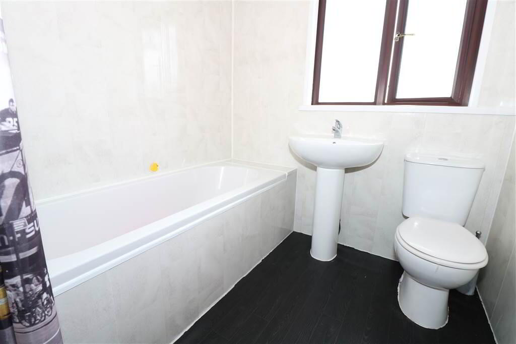 Panel bath, low flush W/C, pedestal wash hand basin, pvc wall cladding, laminate flooring