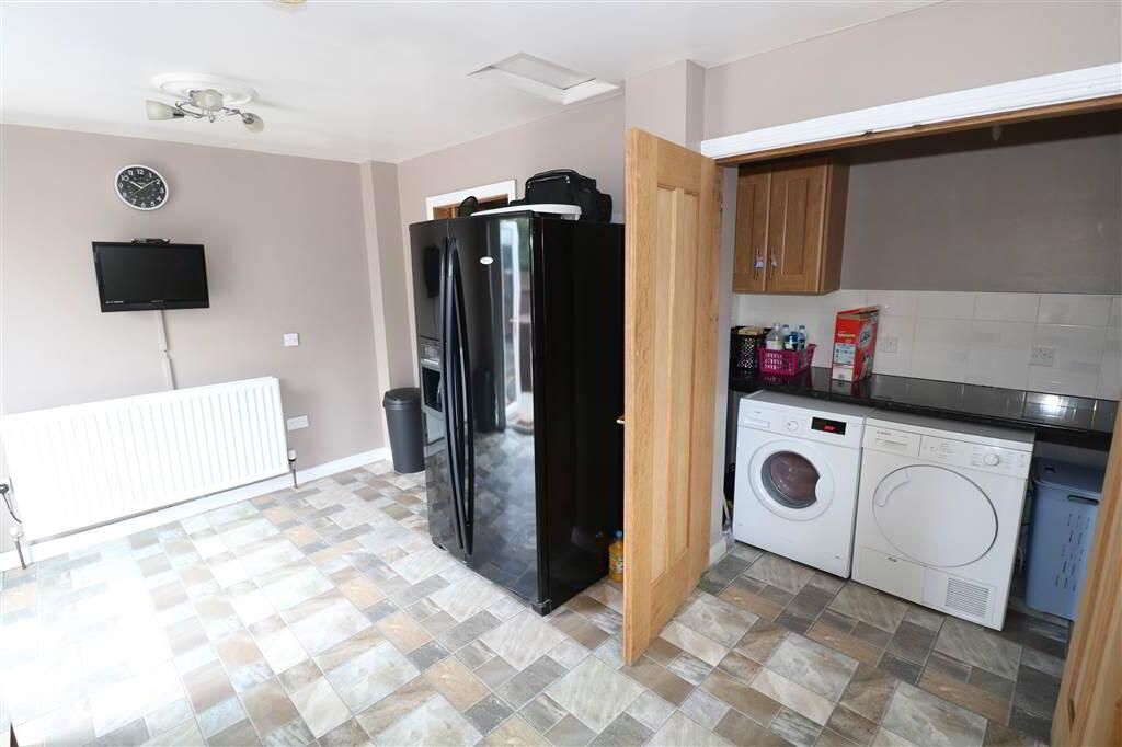 Range of high & low level units, formica worktops, stainless steel sink drainer, part tiled walls, enclosed utility room, laminate flooring