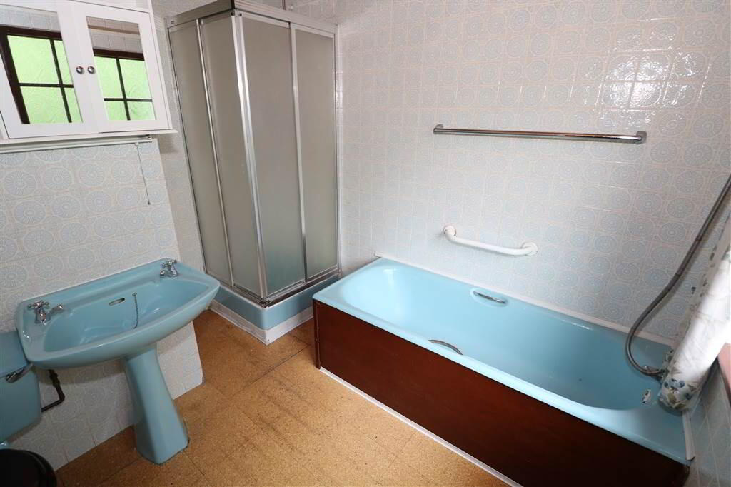 Panel bath, shower cubicle, pedestal wash hand basin, low flush w/c, fully tiled walls