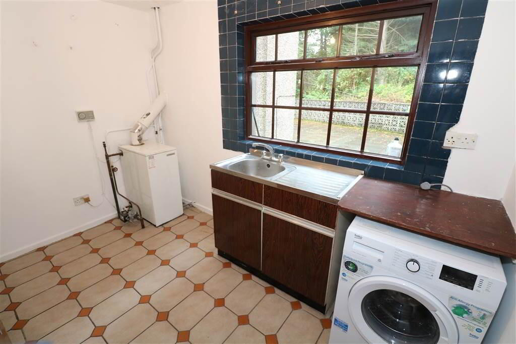 Range of high and low level units, formica work surfaces, gas cooker, integrated hob and oven, part tiled walls, ceramic tile flooring - UTILITY ROOM: