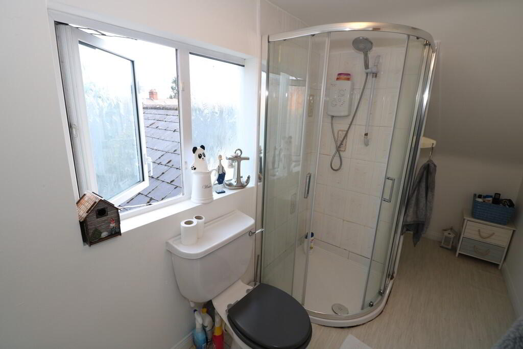 SHOWER ROOM: 7' 9" x 4' 9" (2.36m x 1.44m) White suite comprising shower cubicle, pedestal wash hand basin, PVC wall cladding