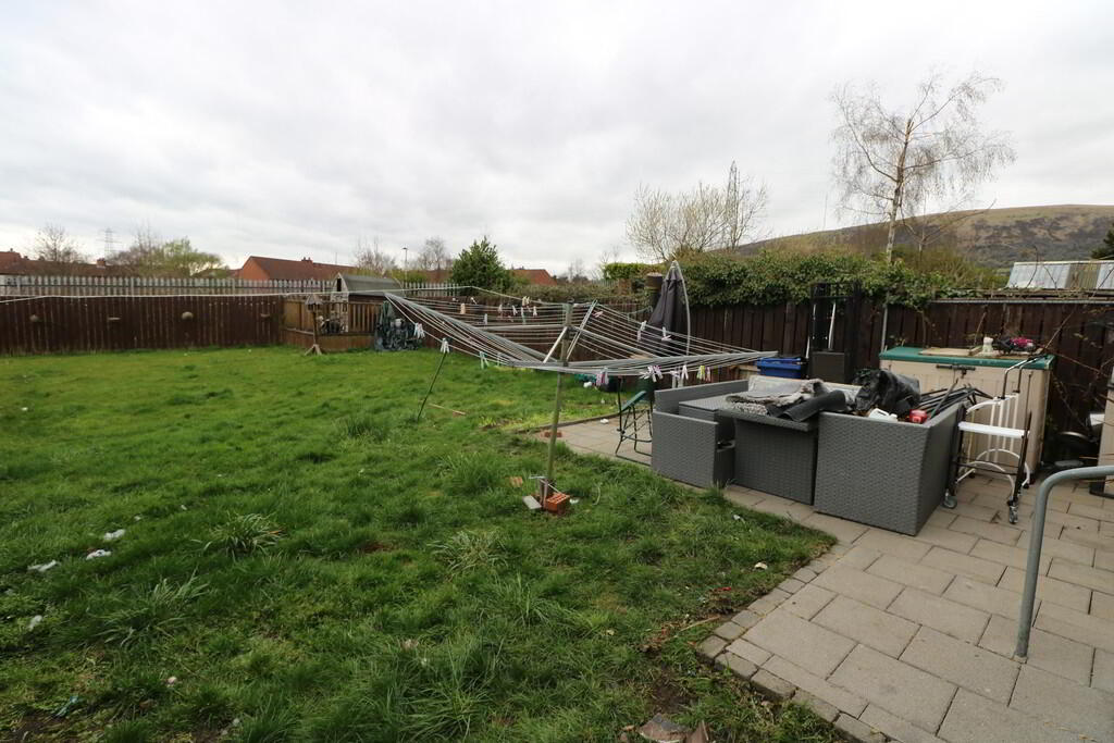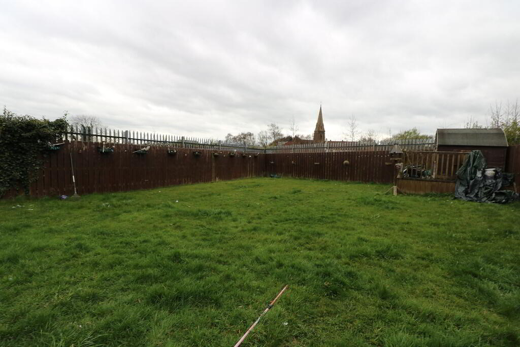 Rear: Extensive garden in lawn enclosed by fencing, paved patio area