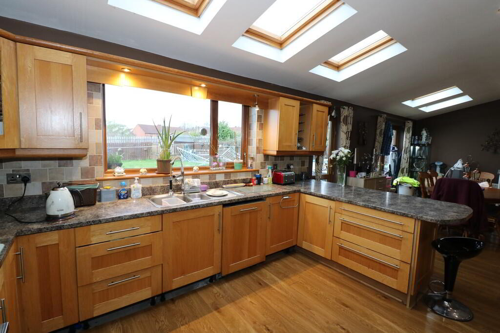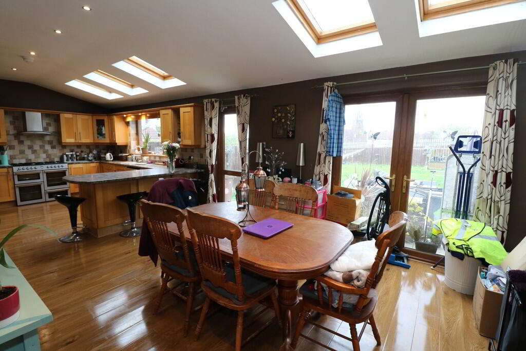 KITCHEN/DINING: 13' 6" x 30' 8" (4.11m x 9.34m) Modern fitted kitchen comprising a range of high and low level units, formica work surfaces, stainless steel sink drainer, integrated dish washer, part tiled walls, velux windows, laminate flooring
