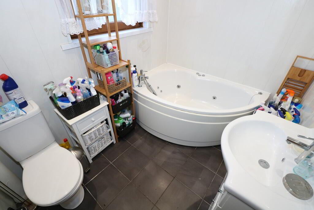 BATHROOM: 6' 4" x 8' 1" (1.94m x 2.47m) White suite comprising jacuzzi corner bath, vanity unit wash hand basin, low flush W/C, PVC wall cladding, ceramic tiled flooring