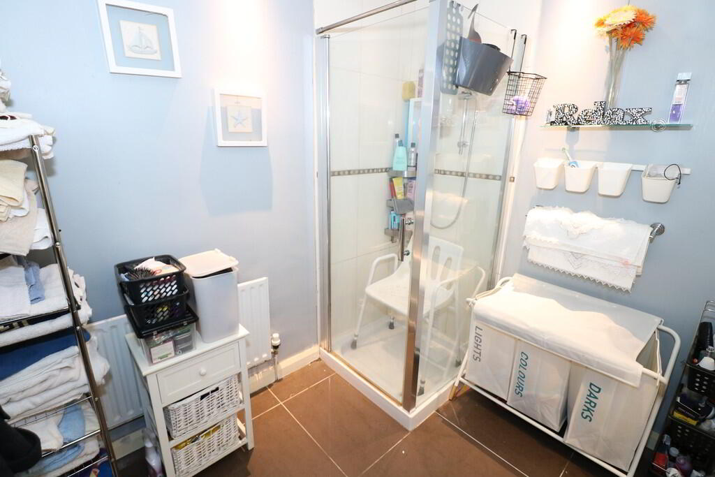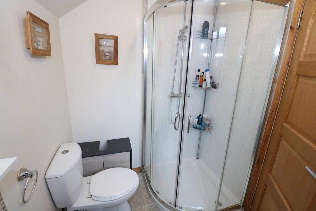 ENSUITE SHOWER ROOM: 6' 2" x 7' 10" (1.88m x 2.40m) White suite comprising shower cubicle, low flush W/C, pedestal wash hand basin, lino flooring