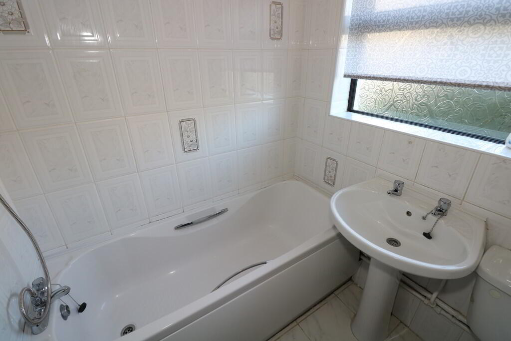 BATHROOM: 1.70m x 1.79m (5’ 5” x 5’ 8”) White suite comprising panelled bath with wall shower, low flush W.C, pedestal wash hand basin, part tiled walls, ceramic wall tiles.