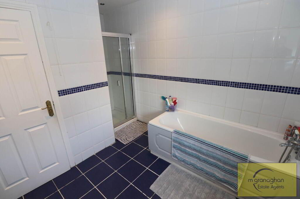 White family bathroom suite comprising of panel bath and separate walk in shower cubicle with overhead shower, pedestal wash hand basin, low flush W/C, chrome towel rail, ceiling spotlights, fully tiled walls, ceramic tile flooring