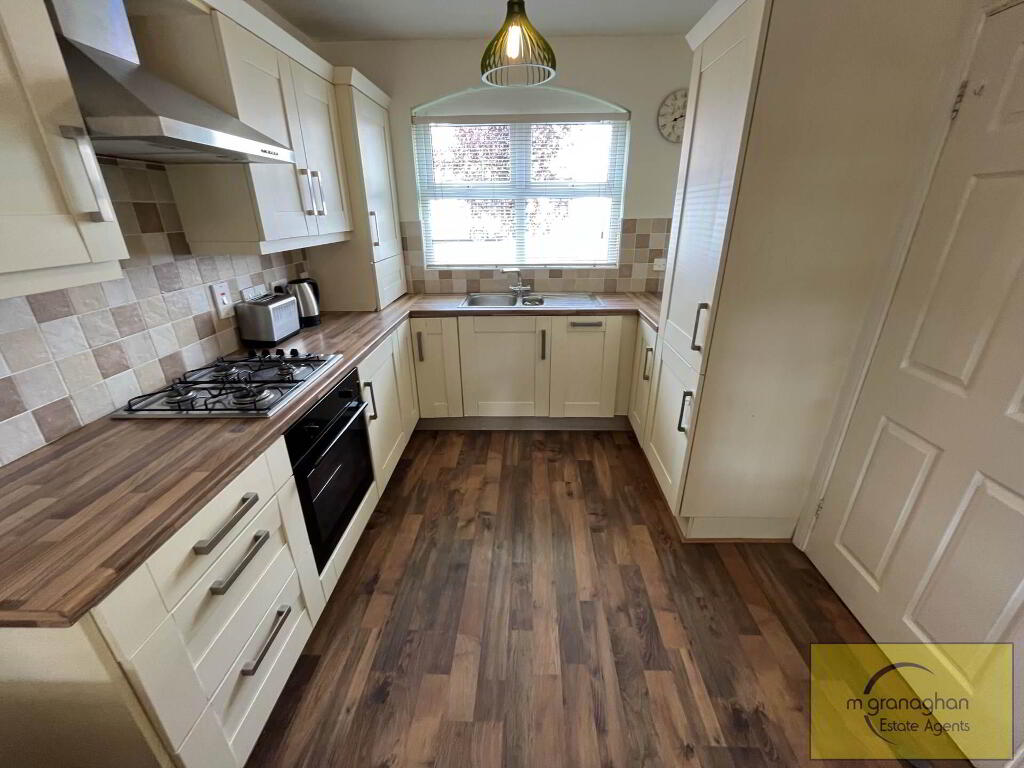 Range of high & low level units, formica wood effect work surfaces, double stainless steel sink drainer, integrated hob & oven, stainless steel extractor fan, built in fridge freezer, built in dishwasher, plumb for washing machine, part tiled walls, laminate flororing