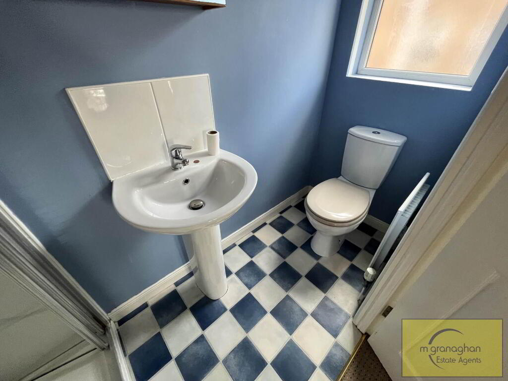 Pedestal wash hand basin, low flush W/C, vinyl flooring