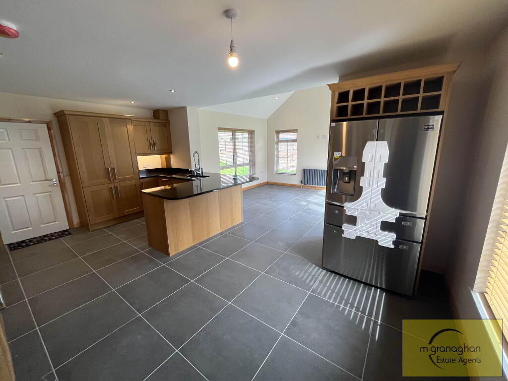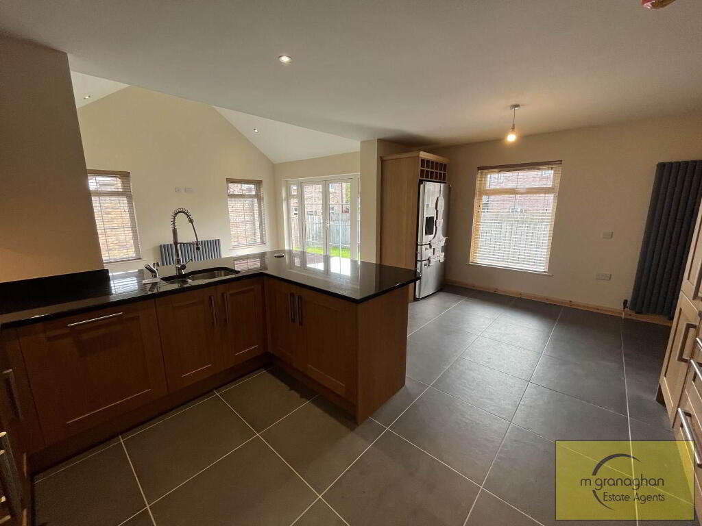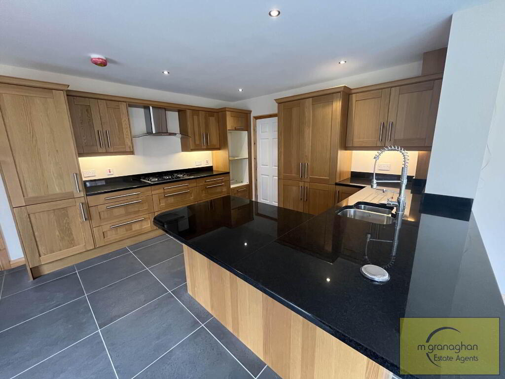 Range of high & low level oak units, granite work surfaces, double stainless steel sink drainer with cooker tap, breakfast bar, stainless steel sink drainer, gas cooker, pop up electrical sockets, plumb for dishwasher, ceiling spotlights, ceramic tiled floors, double doors to rear