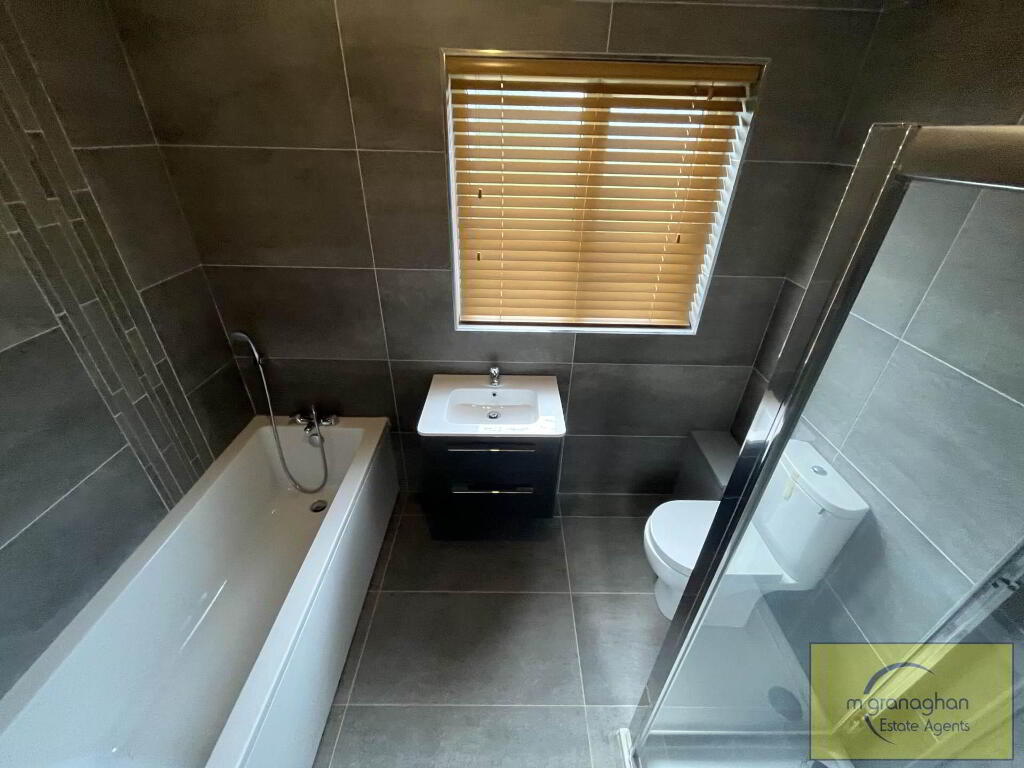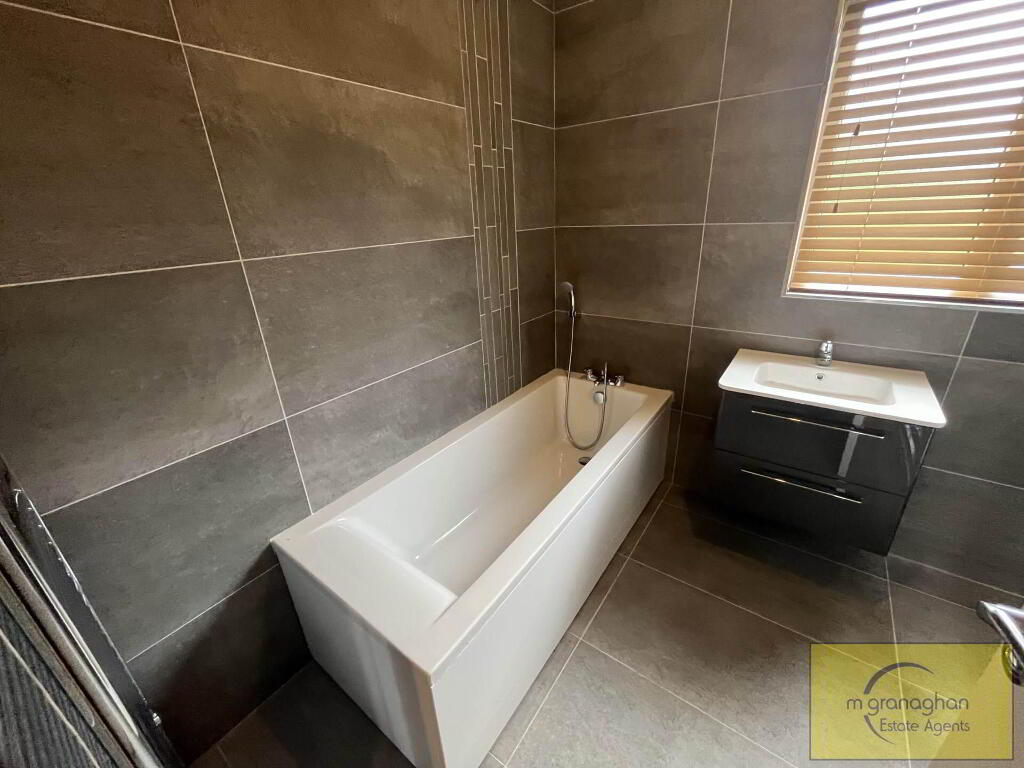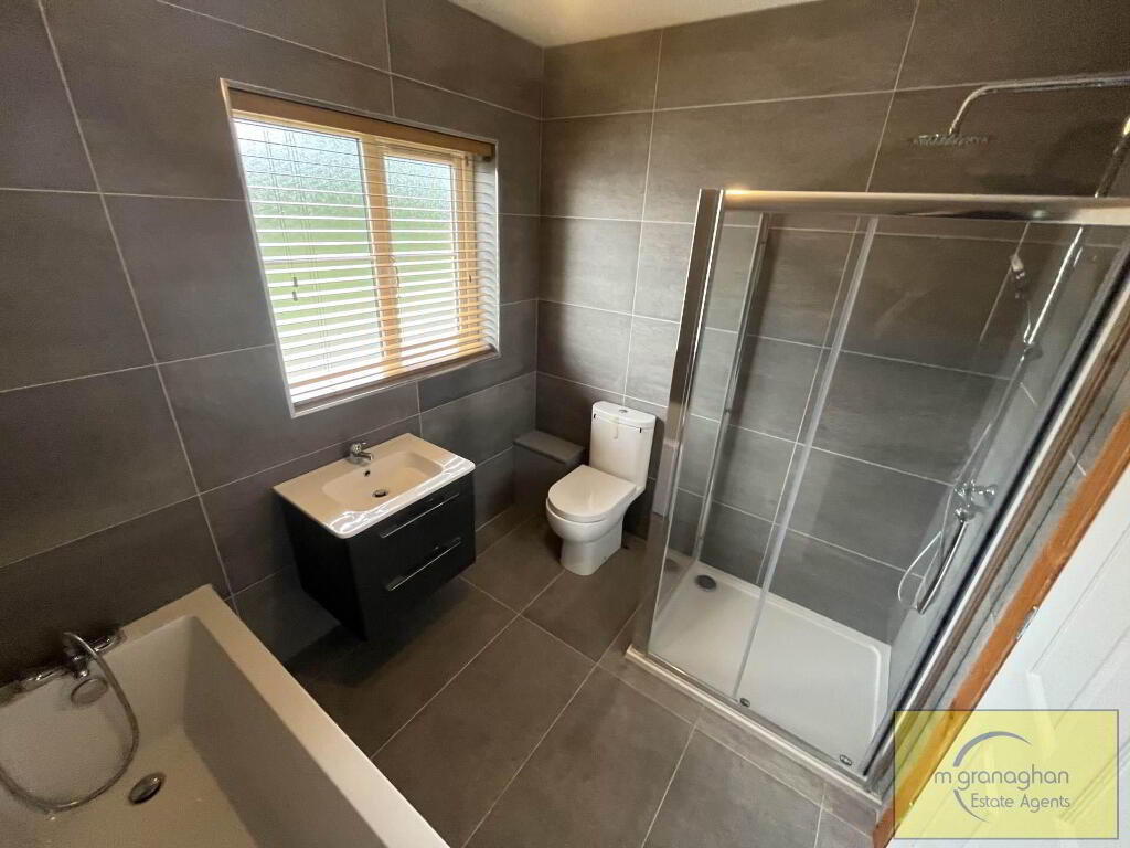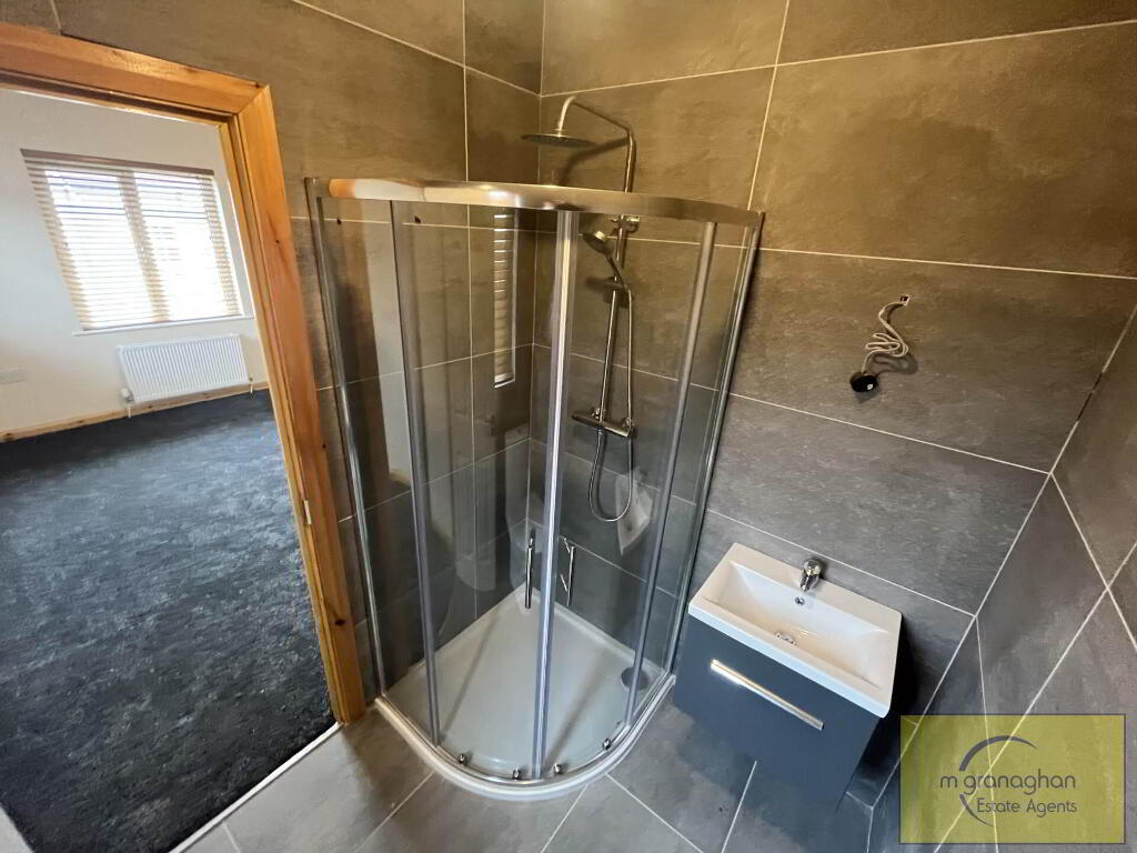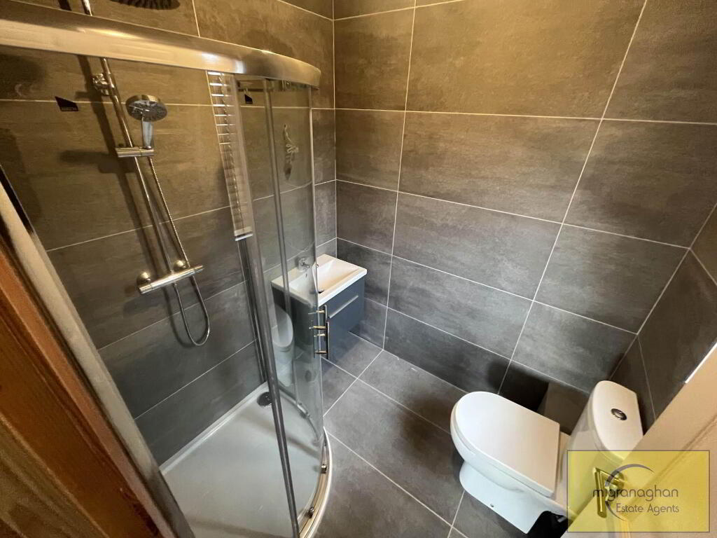 Walk in shower cubicle, vanity wash hand basin, low flush W/C, plugged for LED mirror, chrome towel rail, fully tiled walls, ceramic tiled flooring