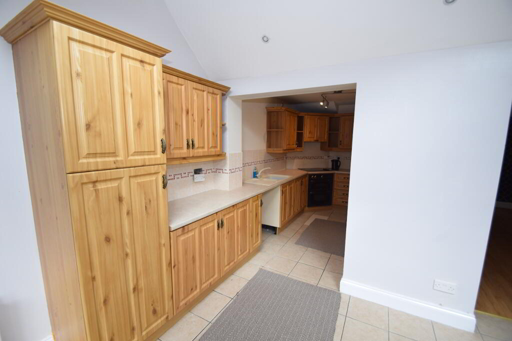 Modern fully fitted kitchen comprising of high and low level units, formica work surfaces, ceramic sink drainer, integrated hob, plumbed for washing machine, ceramic tiled floor
