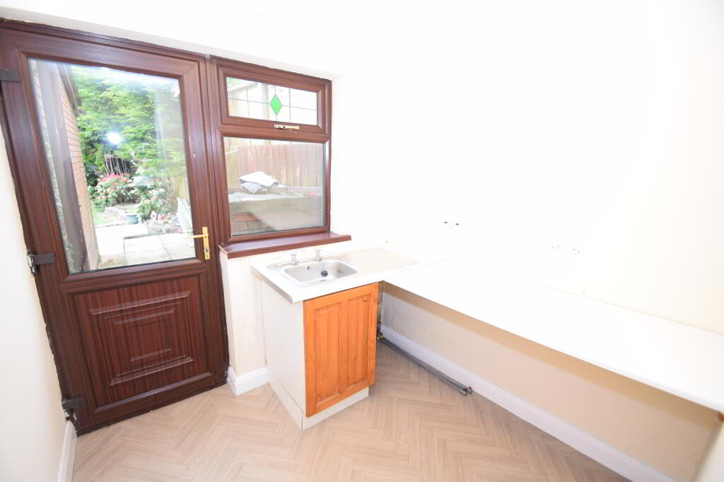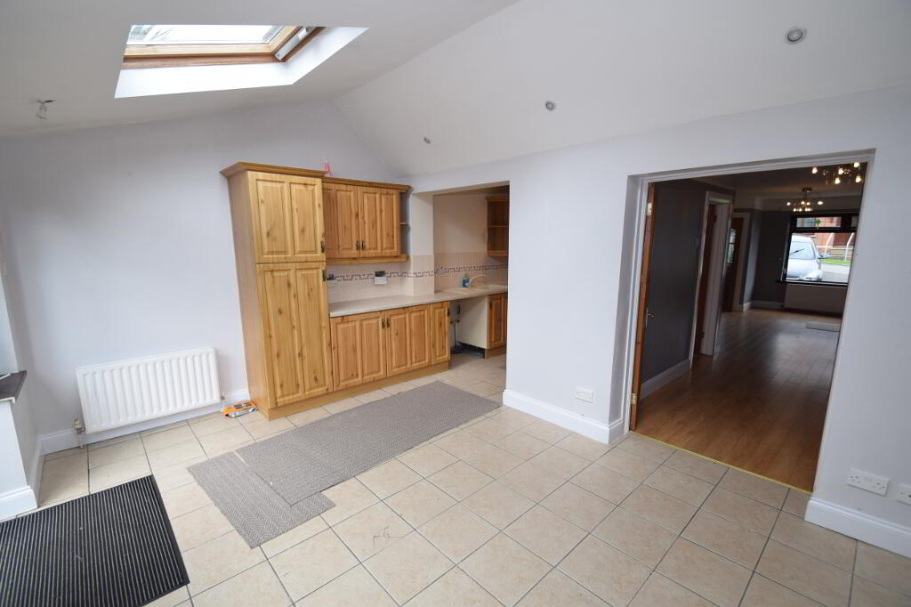 The fully fitted kitchen also features a dining area, perfect for family meals and entertaining guests. There's ample storage space, an integrated hob, built-in oven and extractor fan, as well as a convenient door to the rear garden.
