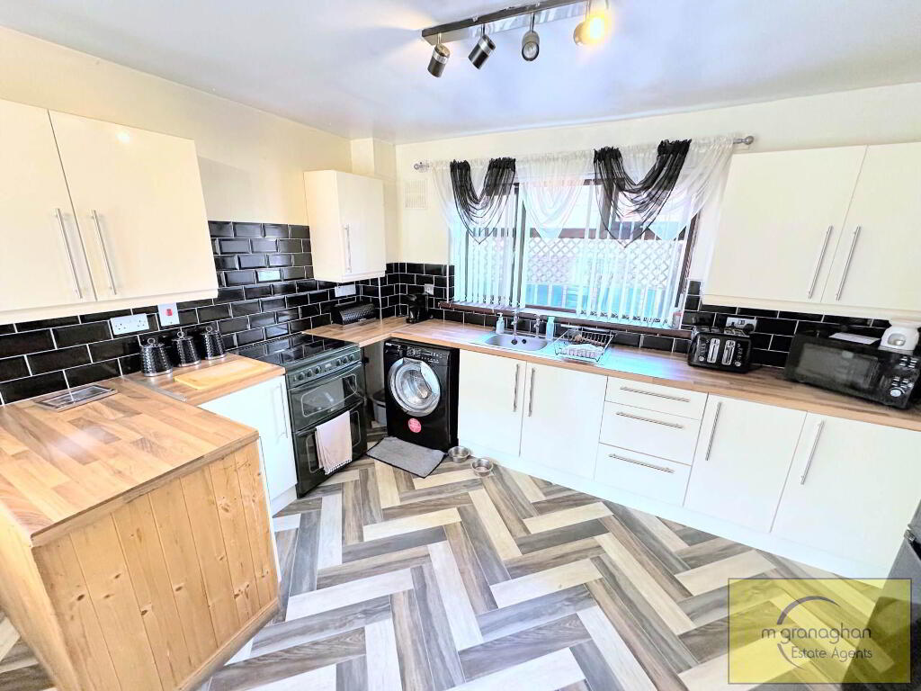 Fully fitted kitchen comprising of high and low level units, formica work surfaces, stainless steel sink drainer, plumbed for washing machine, breakfast bar, vinyl flooring, part tile walls