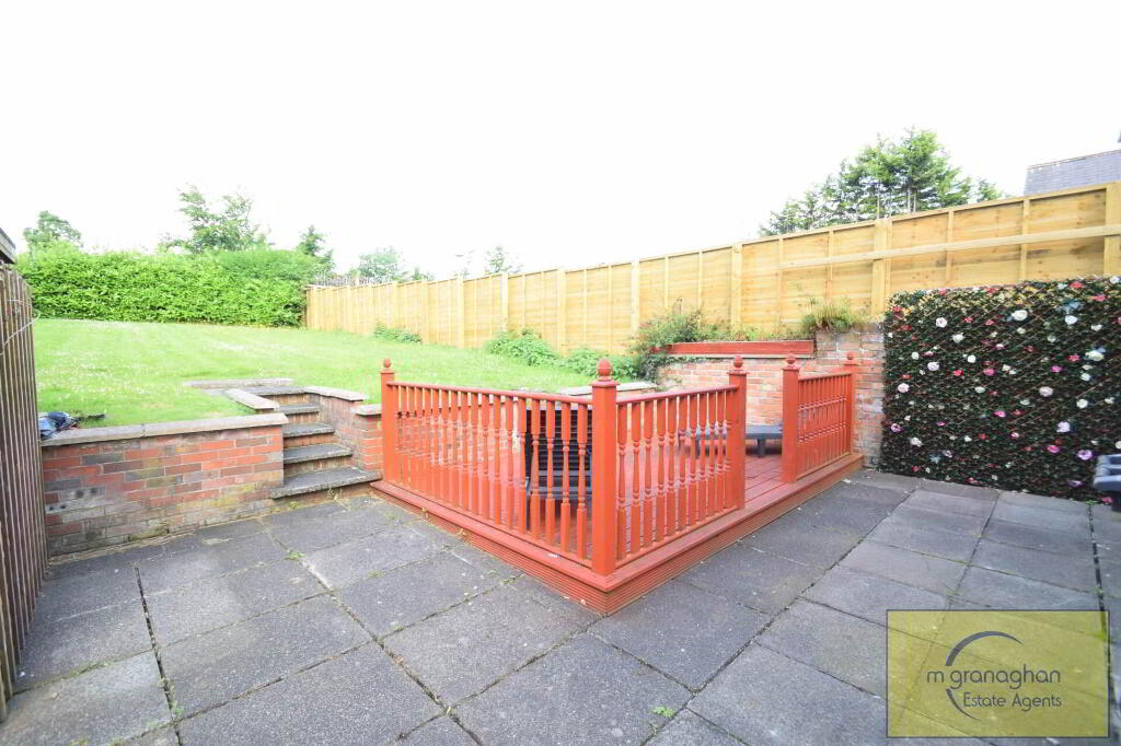 Enclosed rear with tiled patio, decking area, garden in lawn surrounded with mature hedging and shrubs