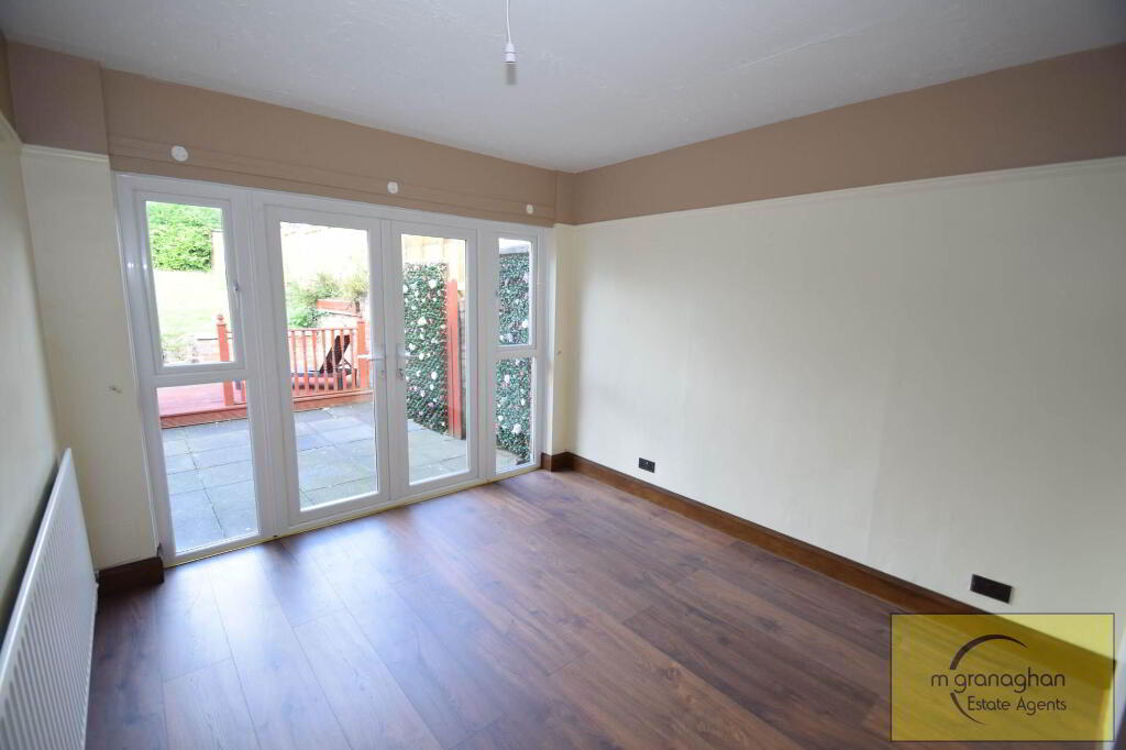 Laminate flooring, double PVC patio doors that lead out to rear tiled patio area
