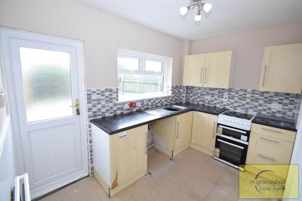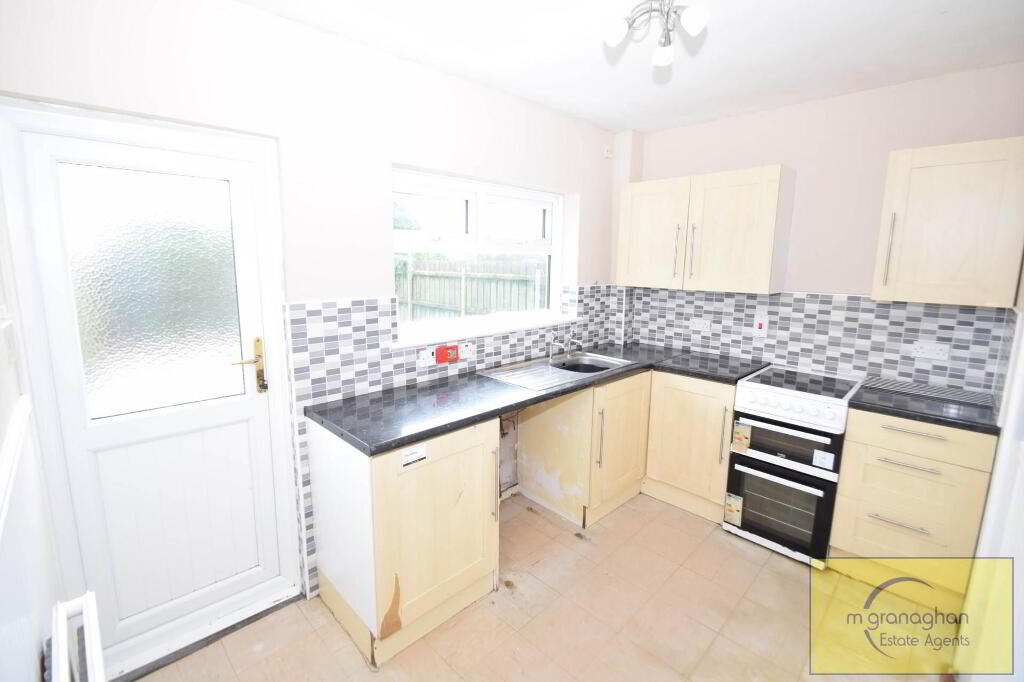 Modern fully fitted kitchen comprising of high and low level units, formica work surfaces, part tile walls, plumbed for washing machine, stainless steel sink drainer, access to the rear