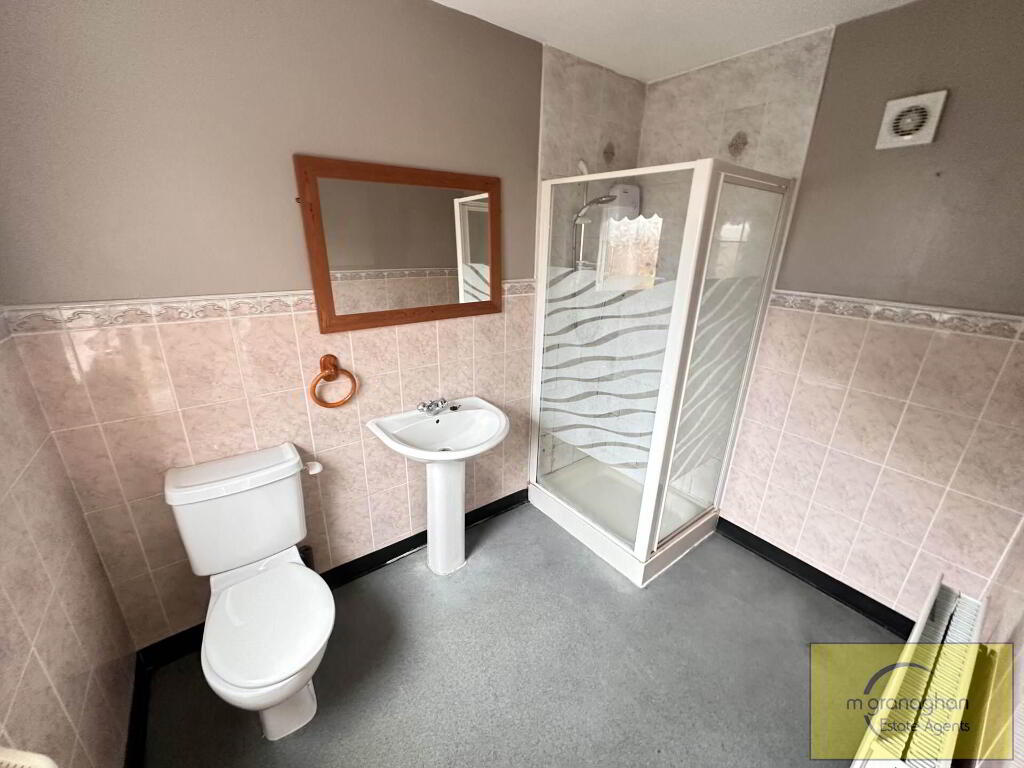White suite comprising of pedestal wash hand basin, low flush W/C, shower cubicle, part tile walls