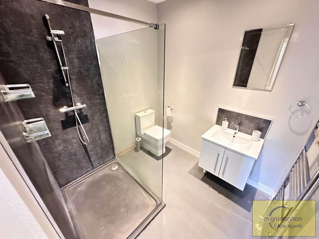 Spotlights, low flush W/C, shower cubicle, vanity unit wash hand basin