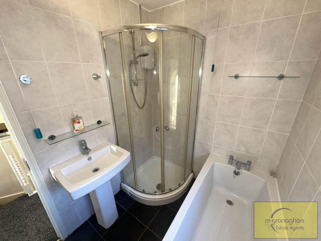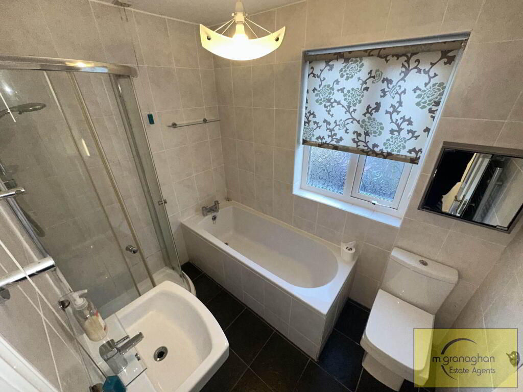 BATHROOM ROOM - 7'11" (2.41m) x 6'3" (1.91m) White bathroom suite comprising of panel bath and shower cubicle, low flush WC, pedestal wash hand basin, fully tiled walls