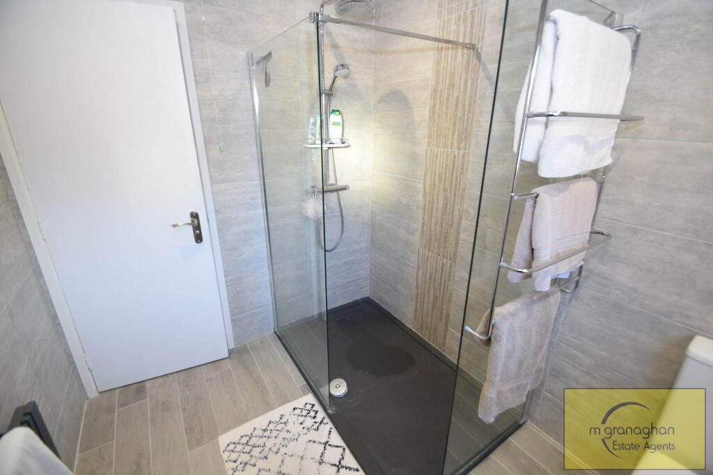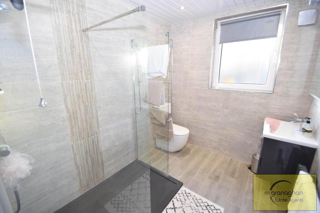 Bathroom - 8'5" (2.57m) x 6'7" (2.01m) Walk in shower cubicle, low flush WC, vanity unit wash hand basin, fully tiled walls, ceramic tiled flooring